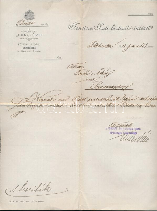 https://www.darabanth.com/en/274-Online-auction/274.0/Other-collectibles/Documents~16/1913-Bekescsaba-Fonciere-Pesti-Biztosito-Intezet-bekes-megyei-fougynoksegenek-fejlece~II1399578