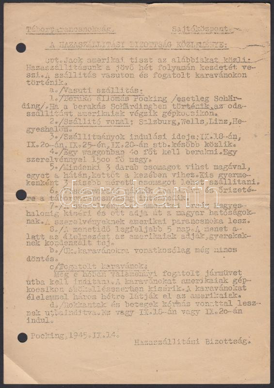 1 db. Pockingi Híradó kiadvány. 1945. IX. 14. kiadvány, amely Hazaszá... https://www.darabanth.com/en/274-Online-auction/274.0/Other-collectibles/Historical-documents-manuscripts~17/1-db-Pockingi-Hirado-kiadvany-1945-IX-14-kiadvany-amely-Hazaszallitasi-Bizottsag-koz~II1363165