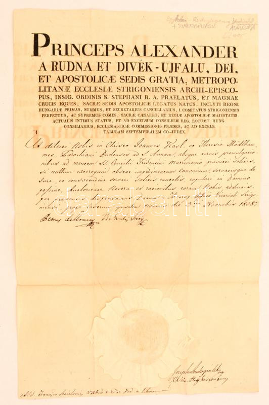 1828 Pest, Rudnay Sándor(1760-1831) esztergomi érsek fejléces papírjára írt házassági engedély, rajta Rudnyánszky József(1788-1859) püspök aláírásával