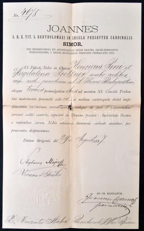 https://www.darabanth.com/en/274-Online-auction/274.0/Other-collectibles/Historical-documents-manuscripts~17/1887-Esztergom-Simor-Janos-ersek-neveben-kiadott-hazassaglevel-Csernoch-Janos1852-1927-alC3~II1400651