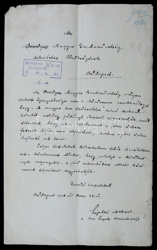 1910 Bp., A magyar Borászati Lapok társszerkesztőjének levele a Magyar Gazdaszövetség Elnökségének