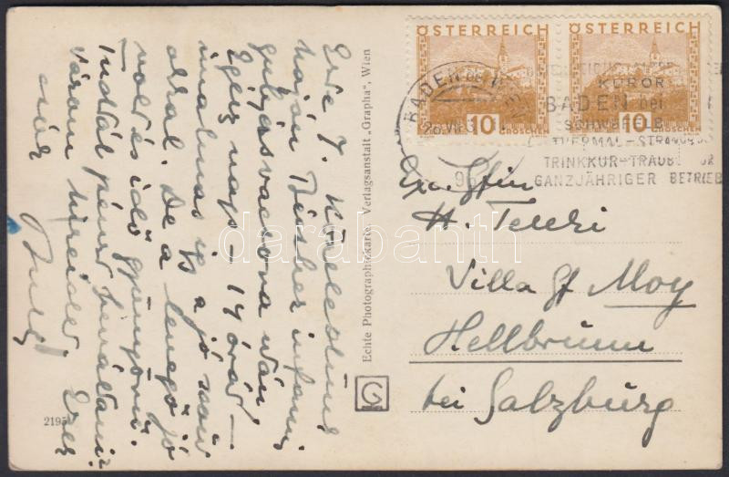 1931 Teleki Pál miniszterelnök saját kézzel írt sorai feleségének, Baden bei Wienből küldött levelezőlapon