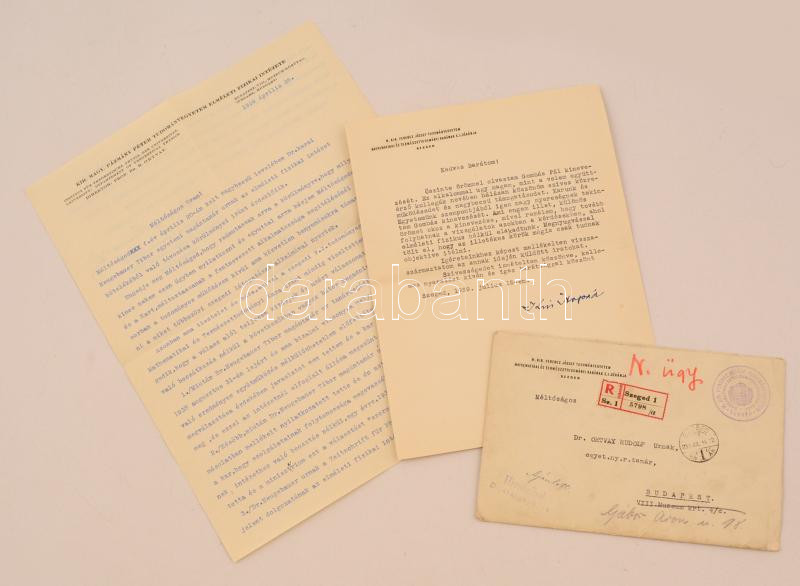 Description: 1939 Kiss Árpád (1889-1968) Kossuth-díjas kémikus és Dr. Ortvay Rudolf (1885-1945) fizikus levelezése,2 db., aláírásokkal, borítókban, a borítékon szegedi egyetem pecsétjével.