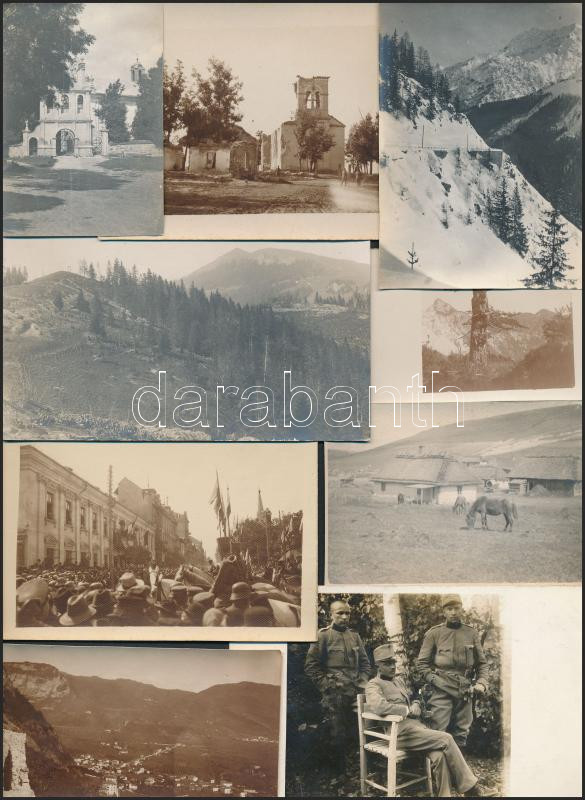 Description: cca 1916 Az I. világháborúban szolgálatot teljesítő, tehetségesen fényképező katona fotóhagyatékából 21 db vintage fotó, néhány feliratozott, 5,5x4 cm és 14x9 cm közötti méretekben