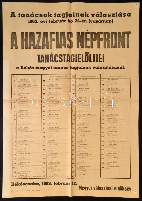 1963 Tanácsi választás plakátja, a békés megyei tanácsi pozíciókért indult Hazafias Népfront jelöltekkel, 84x60 cm.