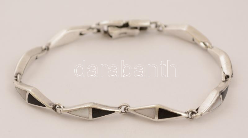 Ezüst(Ag) gyöngyházzal és fekete féldrágakővel díszített rombusz karkötő, jelzett, karcos, h: 19 cm, bruttó: 16,1 g