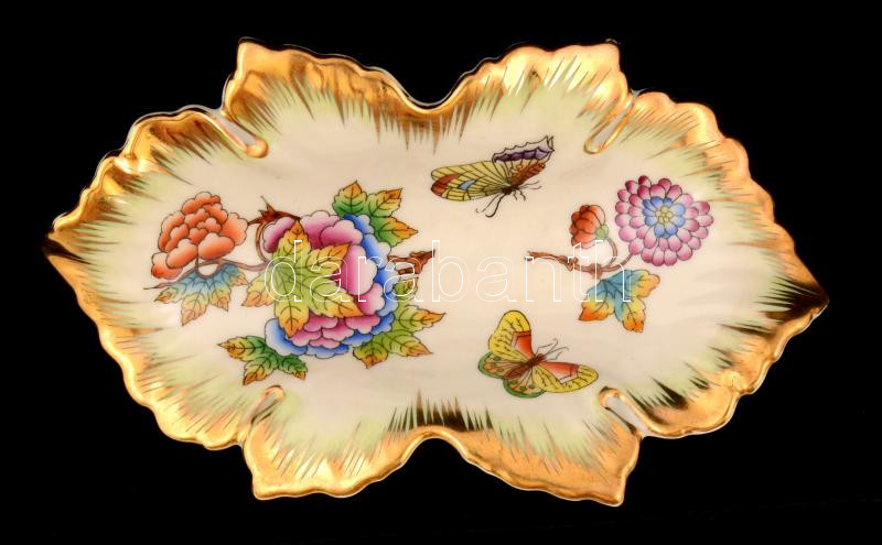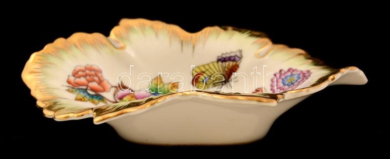 Herendi Viktória mintás leveles tálka, kézzel festett, jelzett, kis kopásnyomokkal, sérült 15×9 cm