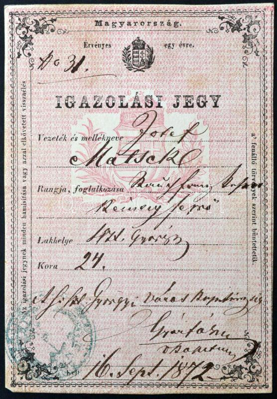 1872 Kéményseprő számára kiállított igazolási jegy / ID