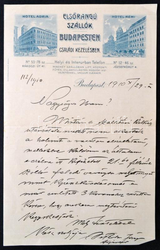 1910 Bp., Hotel Adria, Hotel Rémi - elsőrangú szállók Budapesten, fejléces levél