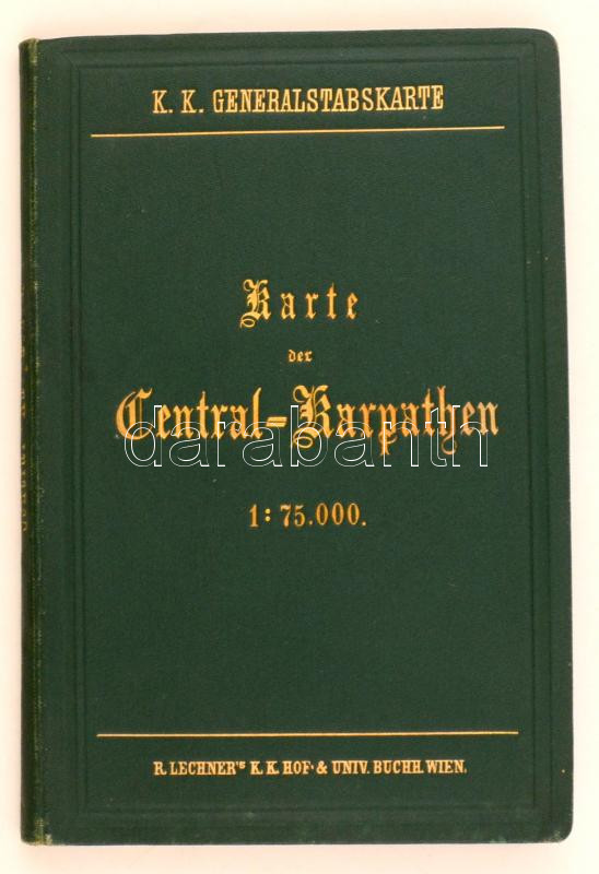 Description: cca 1900 Karte der Central-Karpathen. (A Központi Kárpátok térképe.) 1:75000. K.K. Generalstabskarte. Wien, é.n., R. Lechner's k.k. Hof- und Univ.- Buchhandlung, papír, vászonra kasírozva, kiadói aranyozott egészvászon mappában, 55x72 cm.