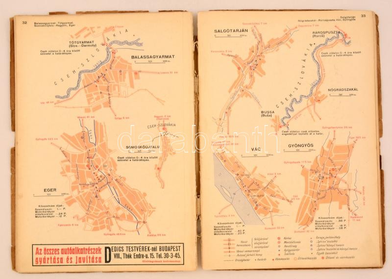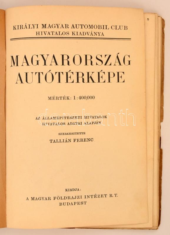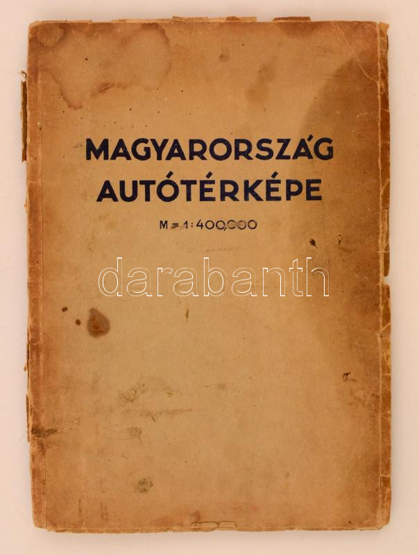 Description: cca 1932 Magyarország autótérképe. Mérték: 1 : 400000. szerk. Tallián Ferenc. Magyar Földrajzi Int. Kir. Magyar Automobil Club hivatalos kiadványa. Foltos fedőborítóval, pp.:84, 25x17cm