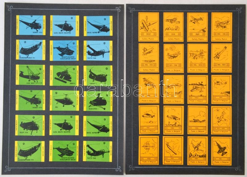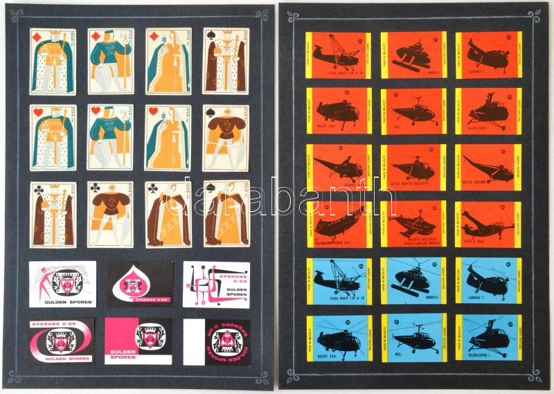 Belga gyufacímke gyűjtemény a kártya, repülő, épületek, reklám, stb. témában, 10db kartonon, 188db, cca 3,5x5cm