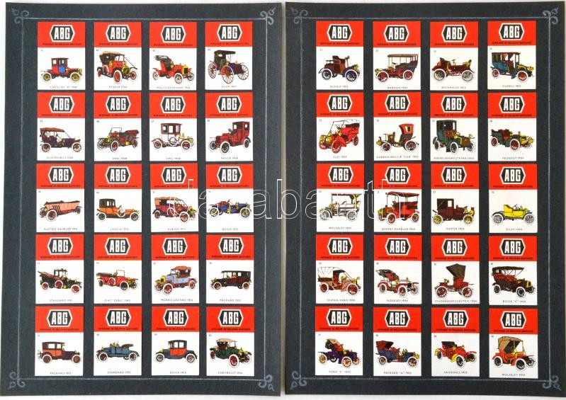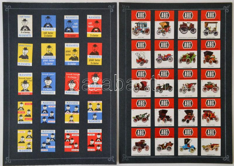 Belga gyufacímke gyűjtemény az Mascotte, ABG autók, címerek, épületek, malmok, stb. témában, 11db kartonon, 227db, cca 3,5x2,5cm