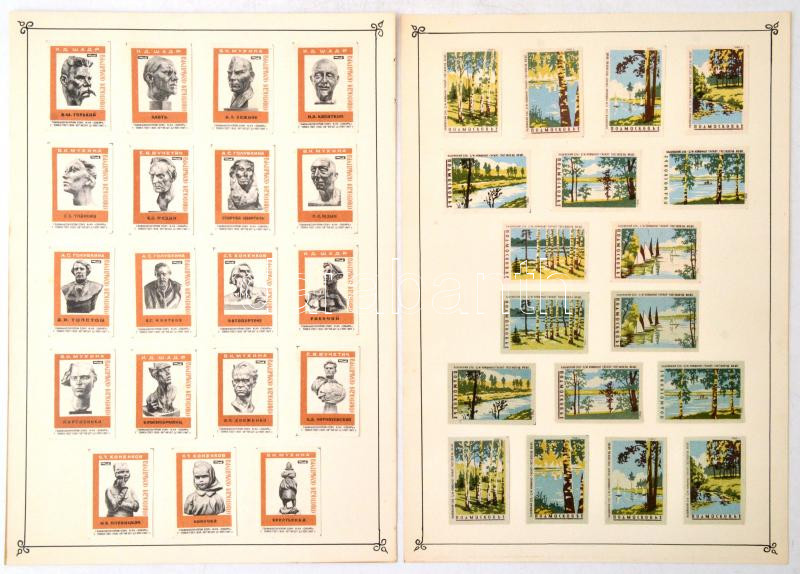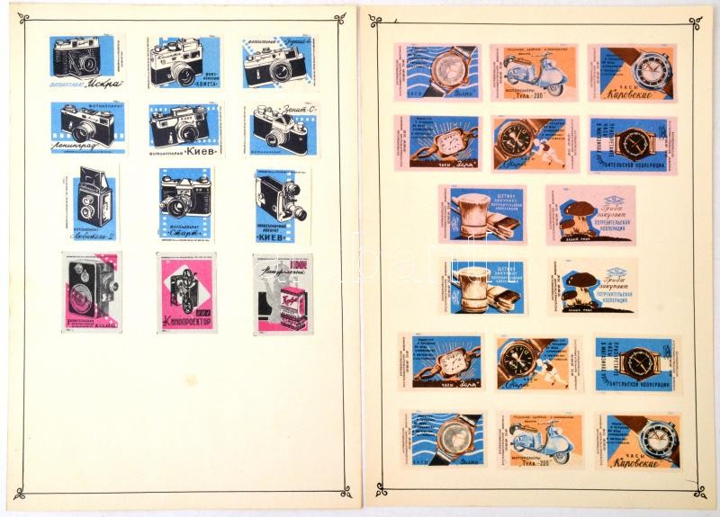 Szovjet gyufacímke gyűjtemény: erdők, a tűz története, óra, fényképezőgép, ital, stb. témában, 14db kartonon, 242db, különböző méretben