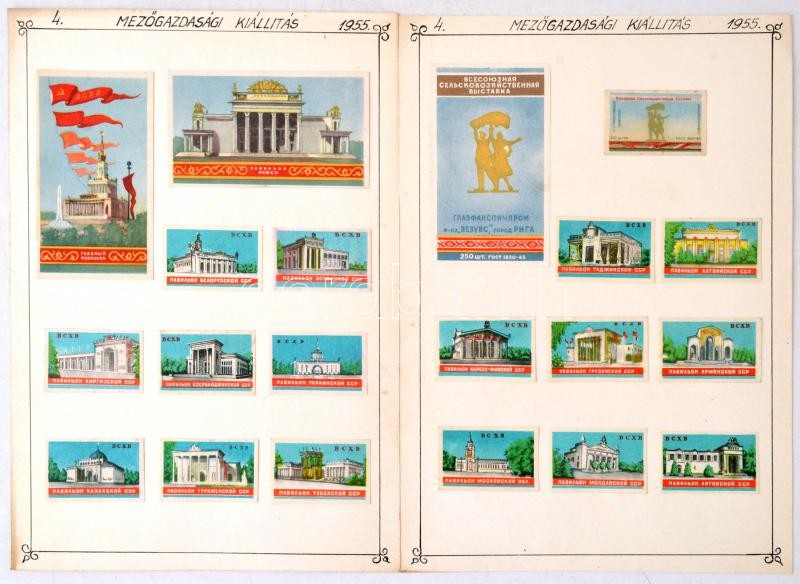 Description: Szovjet gyufacímke gyűjtemény:mezőgazdasági kiállítás, a SzU hatalomért, Moszkva, Novgorod, lakberendezés, stb. témában, 13db kartonon, 205db+11db nagyméretű, különböző méretben