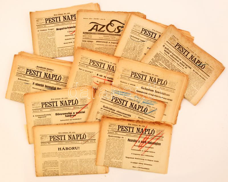 1914 Vegyes háborús újság tétel (11 db): a Pesti Napló 10 db lapszáma ... https://www.darabanth.com/en/275-Online-auction/275.0/Other-collectibles/Military~200247/1914-Vegyes-haborus-ujsag-tetel-11-db-a-Pesti-Naplo-10-db-lapszama-nagyreszt-augusztusi-~II1390928