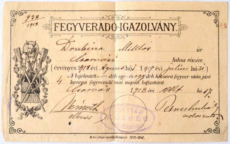 https://www.darabanth.com/en/275-Online-auction/275.0/Other-collectibles/Military~200247/1918-Fegyverado-Igazolvany-kettehajtva-11x17cm~II1402224