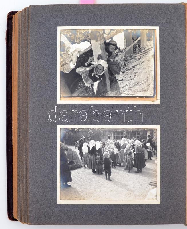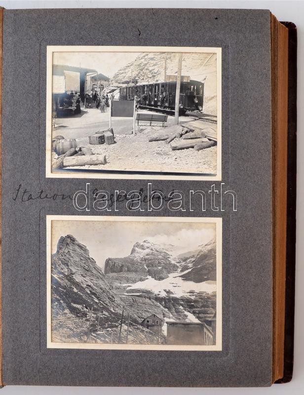 cca 1910 gróf Somssich József (1864-1941) császári és királyi kamarás, magyar külügyminiszter és Sommsich Eszter svájci utazásáról és a család Sárréti és csoóri, kivadári (nagyatádi) birtokán készített életképekkel, vadászatokkal. Kb 80 jó állapotú feliratozott fotó vászonkötésű albumban. Kb 20 vadászatról szóló, kb 10 családtagokat, kb 20 magyar helyszíneket ábrázoló fotóval / Images of the later Hungarian minister of foreign affairs, taken in Switzerland, Andermatt, Scheidegg and images of Hunting in Hungary. about 80 images