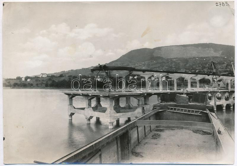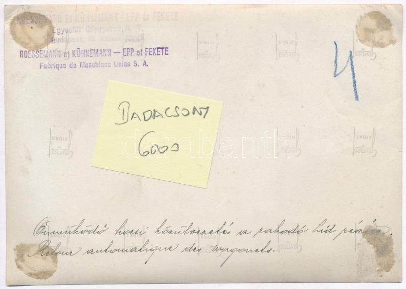Description: cca 1930 Badacsony, Önműködő kocsi körülvezetés a rakodó híd részén. A Roessmann és Kühnemann - Epp és Fekete Egyesült Gépgyárak gyártmánya. Fotó, hátoldalon feliratozva, kissé viseltes állapot, 12×17 cm