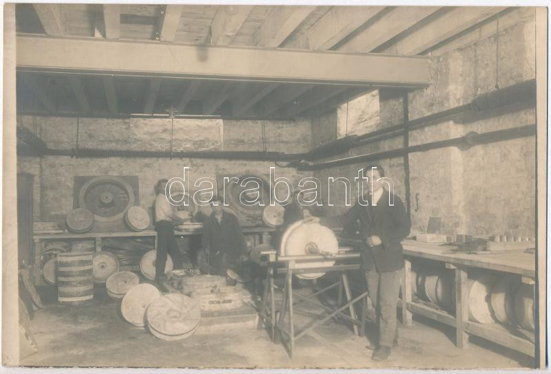 cca 1930 Malomkőkészítő műhely, vintage fotó, 12x18 cm