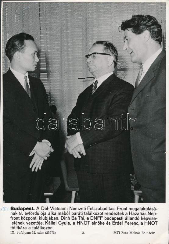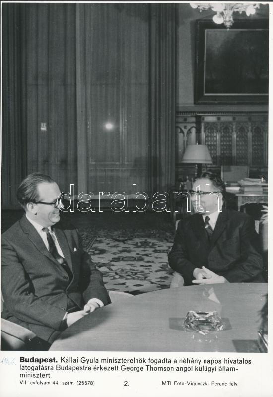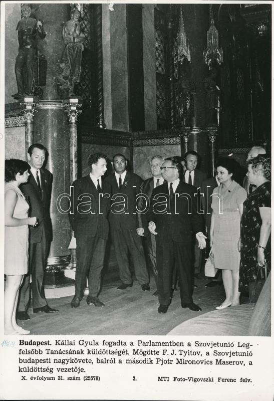 cca 1960 6 db. MTI fotó, köztük négy feliratozott, kettő Vigovszki Ferenc felvétele, a képeken Kállai Gyula és Kádár János különféle politikai eseményeken, és egy fotó a Parlamentről, jó állapotban, 27x19 cm x 4, 19x24 cm, 13x18 cm.