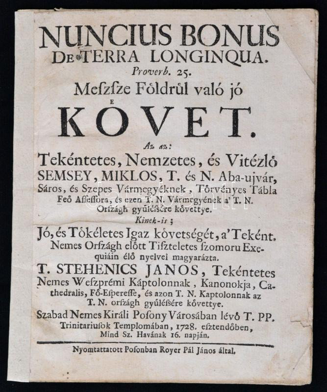 1728 Messze Földrül való jó Követ. Az az tekéntetes, nemzetes és vitéz... https://www.darabanth.com/en/275-Online-auction/275.0/Other-collectibles/Printed-Materials~200265/1728-Messze-Foldrul-valo-jo-Kovet-Az-az-tekentetes-nemzetes-es-vitezlo-Semsey-Miklos-T-~II1405472