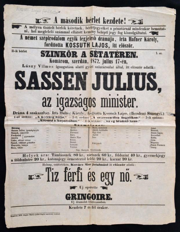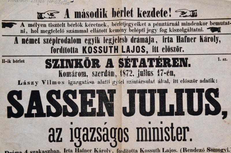 1872 Kossuth Lajos által fordított darab előadásáról szóló színházi plakát. Komárom. 32x40 cm