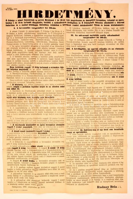 1897 Bp., A német császár érkezése alkalmából biztonsági és egyéb okok... https://www.darabanth.com/en/275-Online-auction/275.0/Other-collectibles/Printed-Materials~200265/1897-Bp-A-nemet-csaszar-erkezese-alkalmabol-biztonsagi-es-egyeb-okokbol-hozott-rendori~II1407041