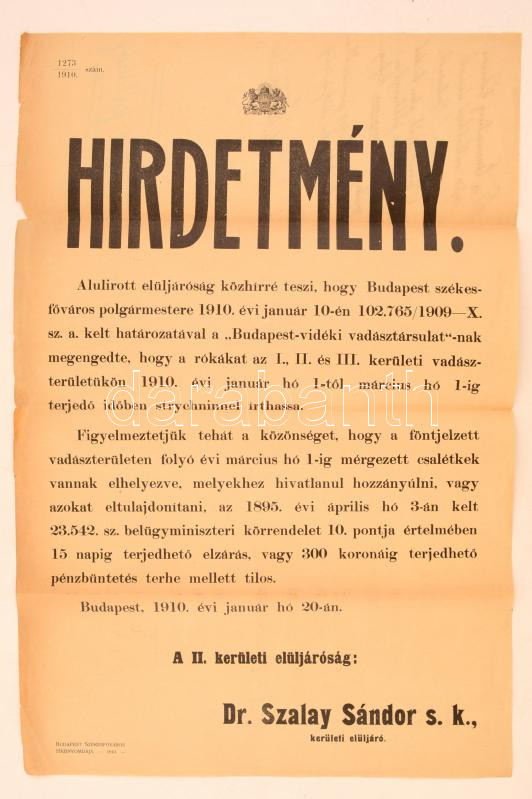1910 Bp., Nagyméretű hirdetmény a Budapest-vidéki vadásztársulatnak az I-II-II. kerület területére engedélyezett rókairtásáról, hajtott, 47x31 cm