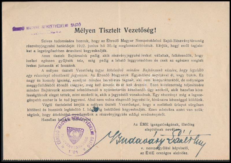 1922 Ébredő Magyar Nemzetvédelmi Szövetség részvényjegyzésre felszólító Budaváry nemzetgyűlési képviselő aláírásával