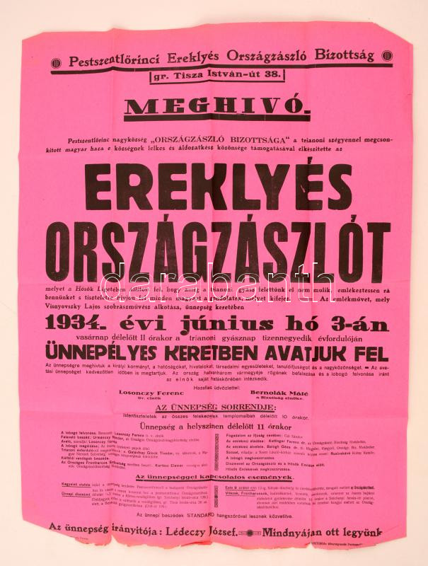 1934 A Pestszentlőrinci Ereklyés Országzászló Bizottság meghívója az ereklyés országzászló avatására, nagyméretű plakát, hajtott, 62x47 cm