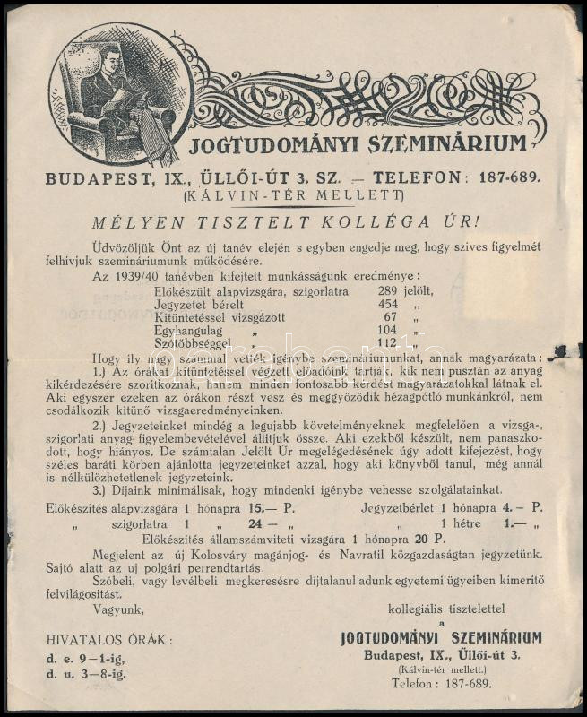 1939-1941 Bp.IX. Kálvin tér, A Jogtudományi Szeminárium 2 db szórólapja