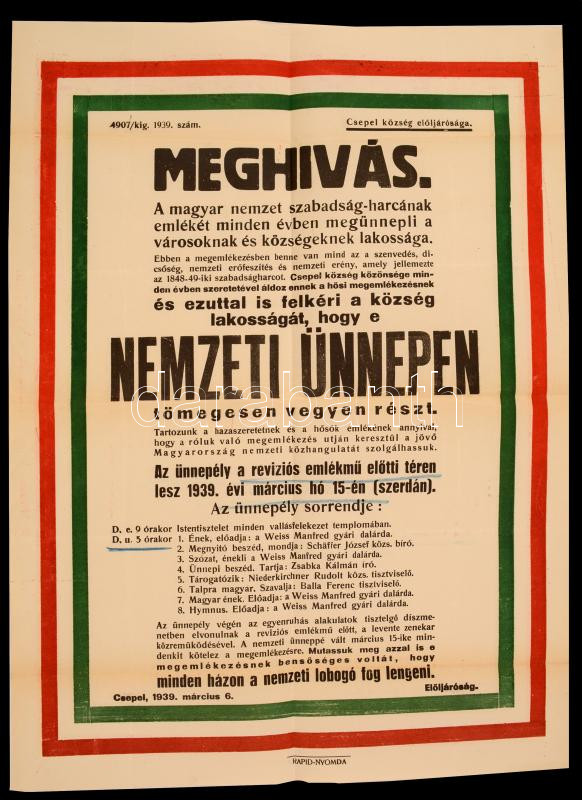 1939 Csepel község nagyméretű plakátja, meghívó a március 15-ei ünneps...