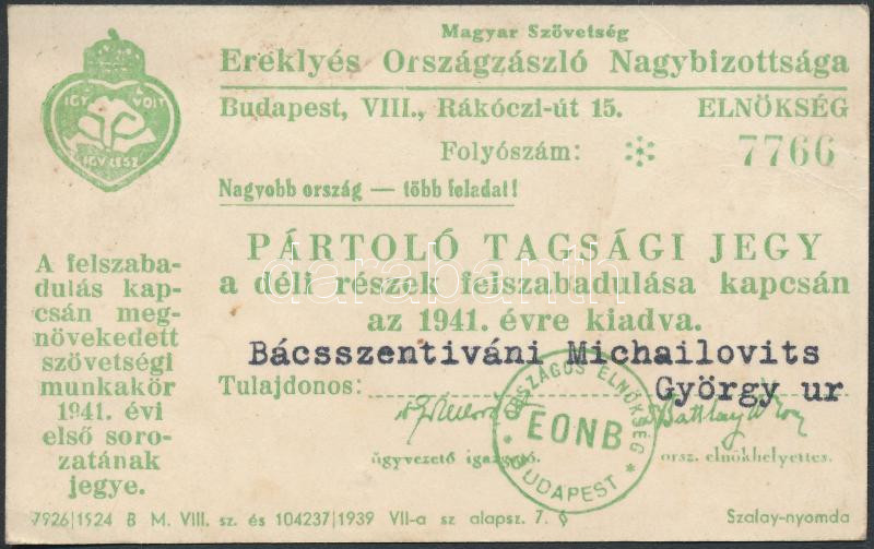1941 Bp. VIII., A Magyar Szövetség Ereklyés Országzászló Nagybizottságának pártoló tagsági jegye