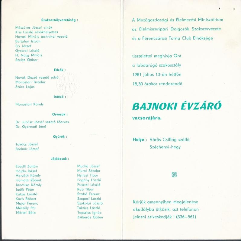 1981 Az FTC meghívója a 23. bajnoki évzáró vacsorára, menükártyával, 2 db