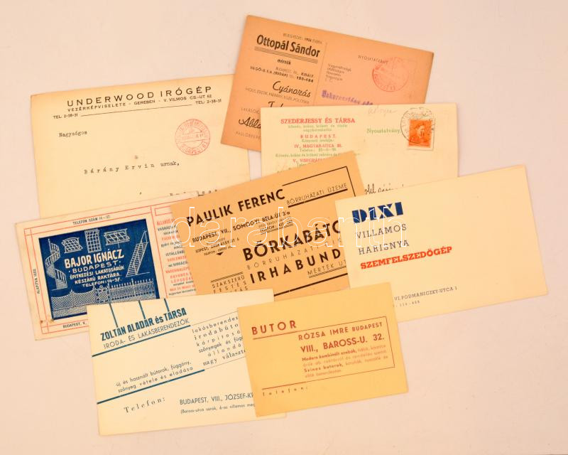 cca 1930-1940 Különféle szórólapok: Rózsa Imre Bútor Budapest, Zoltán Aladár és Társa Lakásberendezők, Paulik Ferenc Bőrkabátok, stb., 8 db