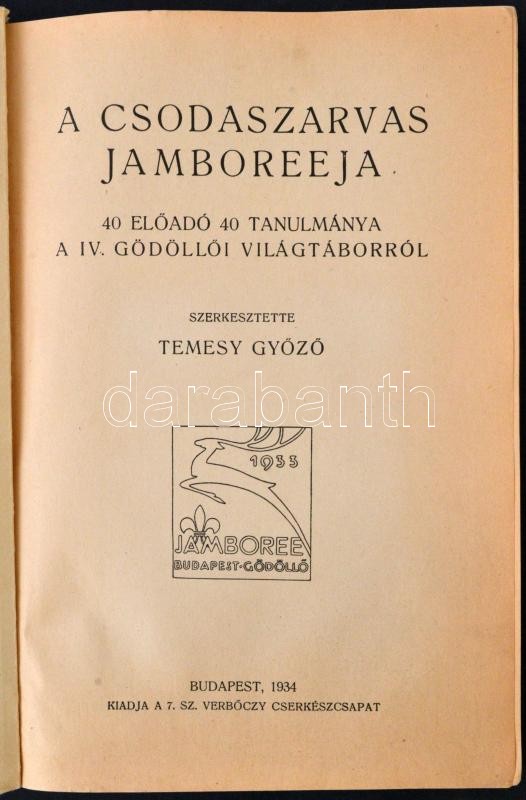 Temesy Győző (szerk.): A csodaszarvas Jamboreeja. 40 előadó 40 tanulmánya a IV. Gödöllői világtáborról. Budapest, 1934, Verbőczy Cserkészcsapat. + Nagyméretű cserkész fotó, 30x24cm