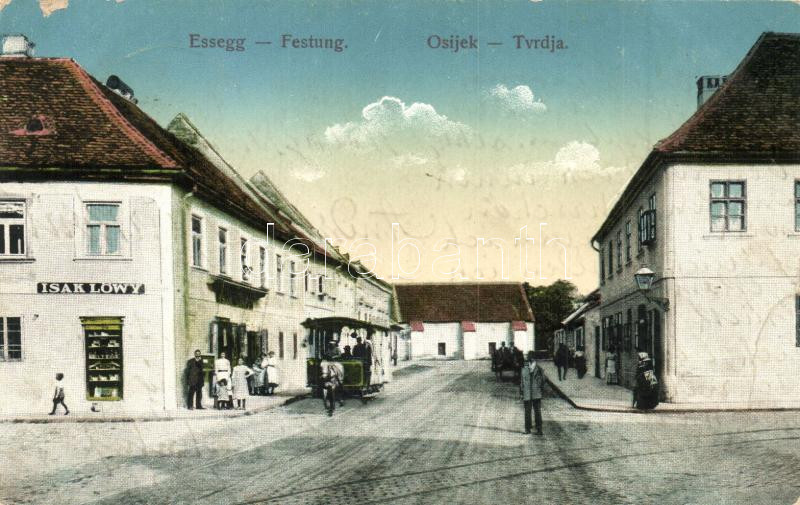 Eszék, Osijek, Essegg; Erőd, villamos, Isak Löwy üzlete / fortress, tr...