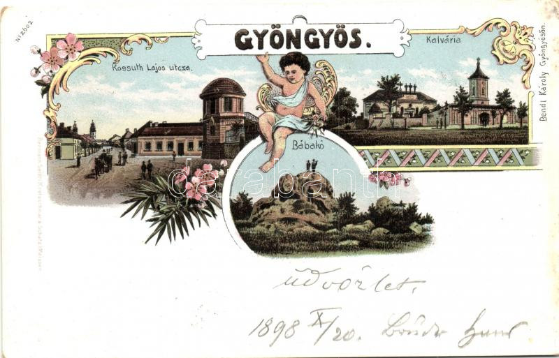 1898 Gyöngyös, Kossuth Lajos utca, Bábakő, Kálvária; kiadja Bendl Károly, floral litho