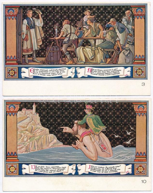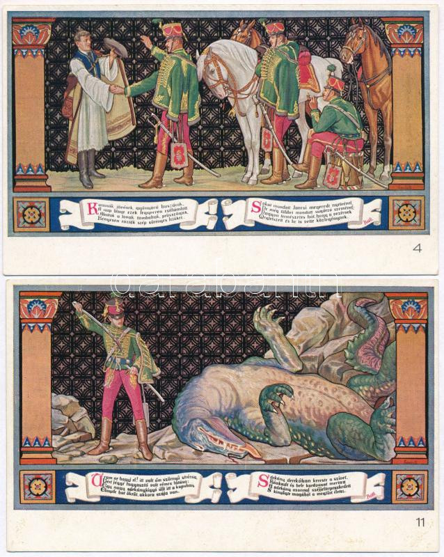 Description: Budapest V. Erzsébet Királyné Szálló étterem és söröző pince, Sándor Béla falfestménye Petőfi János vitézéből - 12 db régi megíratlan képeslap / 12 pre-1945 unused postcards
