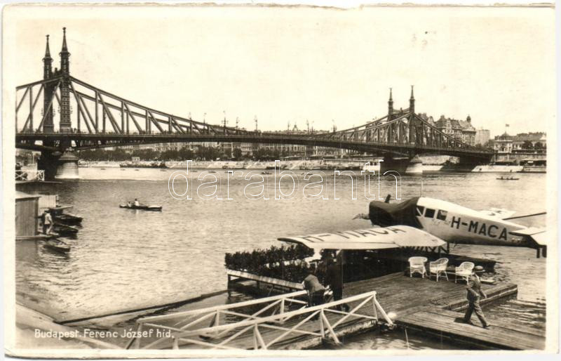 Budapest XI. Ferenc József híd, az Aeroexpress Rt. hidroplán állomása ... https://www.darabanth.com/en/275-Online-auction/275.0/Postcards/Hungary~400010/Budapest-XI-Ferenc-Jozsef-hid-az-Aeroexpress-Rt-hidroplan-allomasa-a-Gellert-Szallo-elot~II1406381