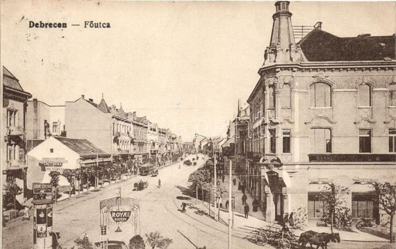 Debrecen, Fő utca, villamos, reklámok