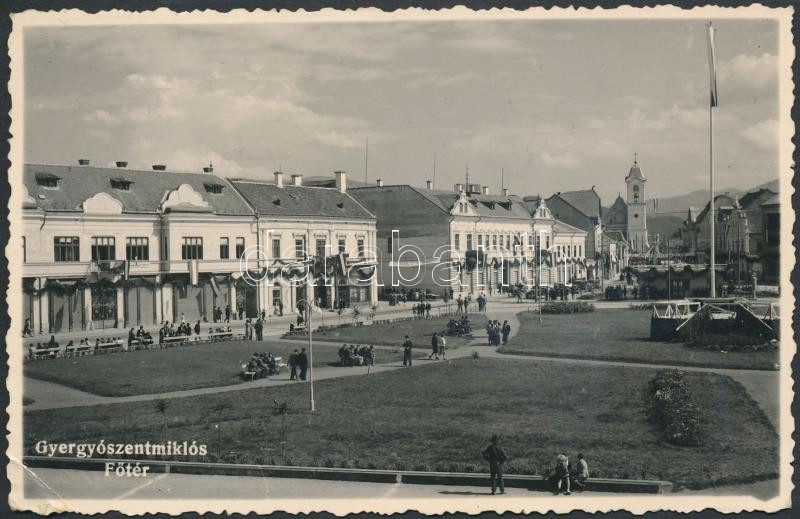1940 Gyergyószentmiklós, Gherogheni; Főtér országzászlóval 'Gyergyósze...