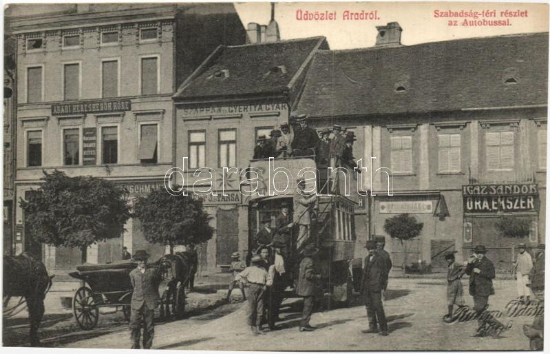 Arad, Szabadság tér, városi autóbusz állomás, Igaz Sándor óraüzletével. Ruhm Ödön felvétele, kiadja Kerpel Izsó / Liberty Square with autobus station
