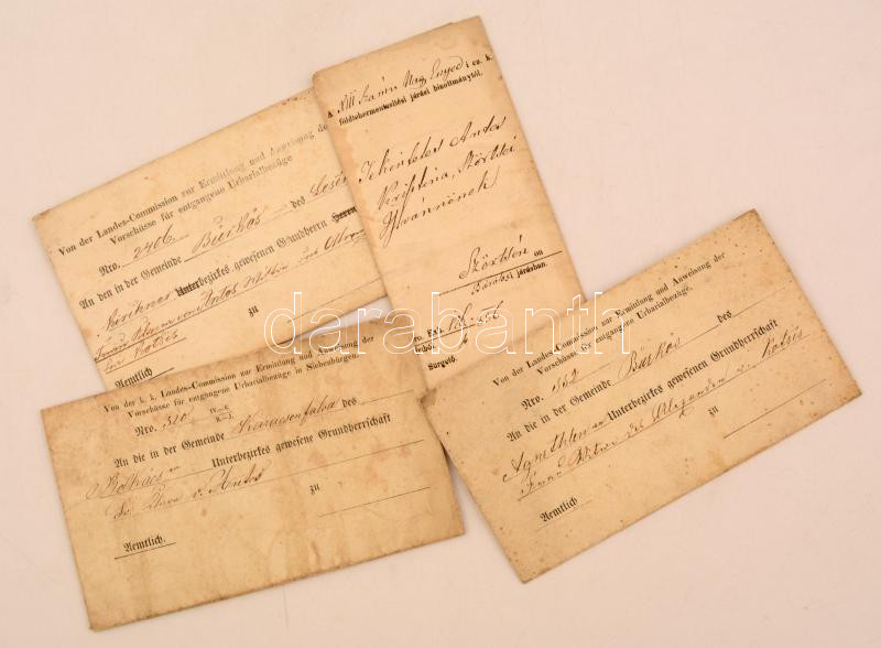 Description: 1851-1856 Vegyes okmány tétel német és magyar nyelven, 4 db: 3 úrbéri-bizottsági levél (Bürkös, Karácsonyfalva), és egy idézvény a földtehermentesítési járási bizottságtól (Farkastelke), okmánybélyegekkel, aláírásokkal
