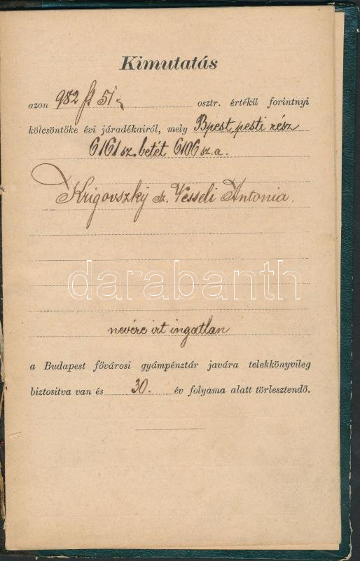 1881 Budapest Fővárosi Gyámpénztár, ingatlan törlesztő könyvecske okmá...