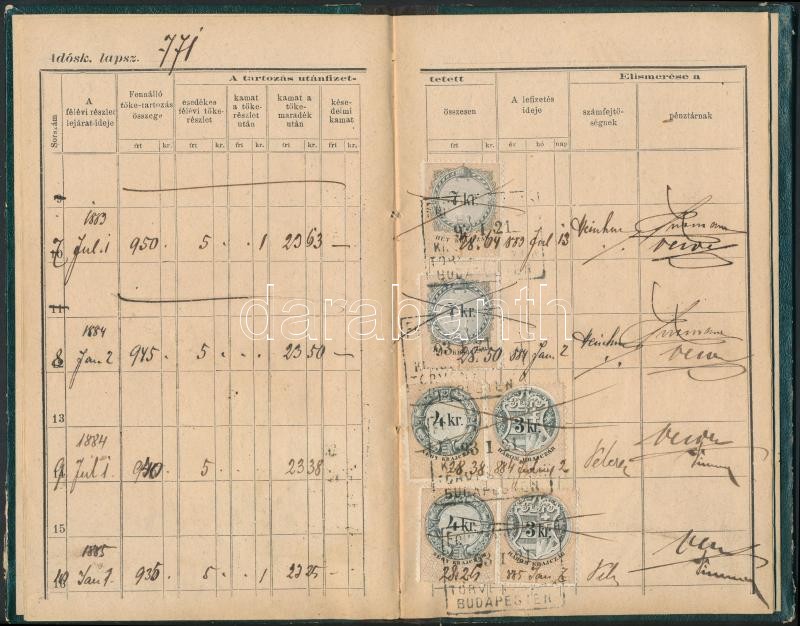 1881 Budapest Fővárosi Gyámpénztár, ingatlan törlesztő könyvecske okmánybélyegekkel, aláírásokkal 1892-ig