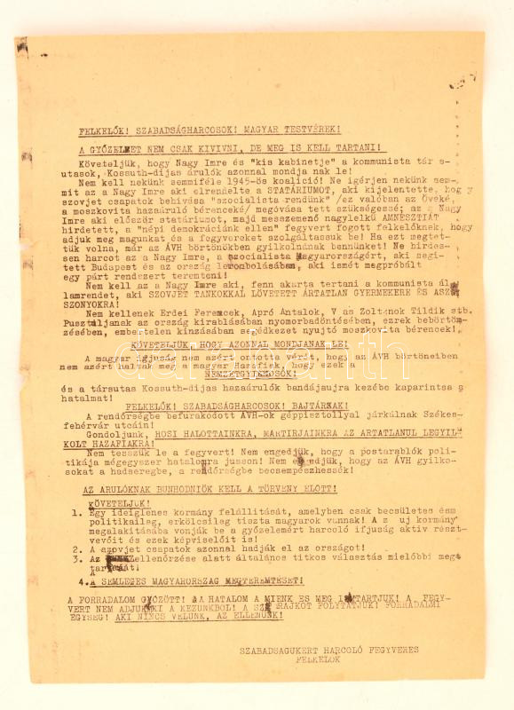 1956 Szabadságukért Harcoló Fegyveres Felkelők röplapja, a forradalom ...
