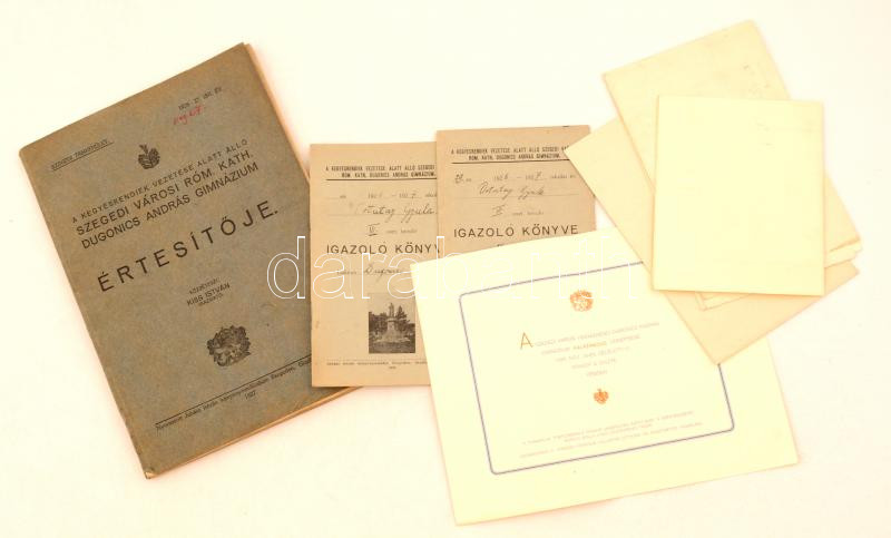 Description: 1926-27 Ortutay Gyula(1910-1978) iskolai papírjai az 1926-27-es tanévből, a kegyesrendiek vezetése alatt szegedi róm. kath. Dugonics András gimnáziumból,