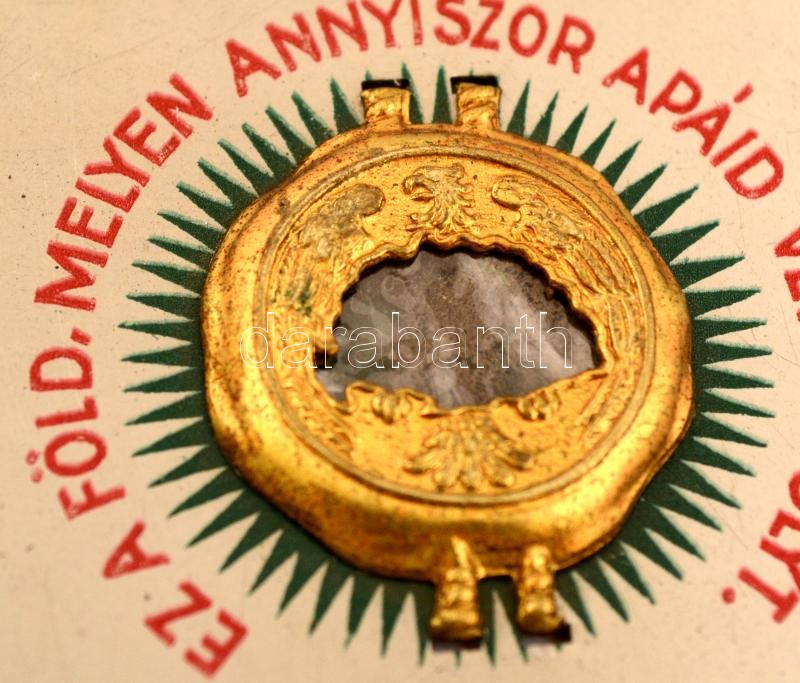 Description: cca 1920 Nemzeti Ereklye Bizottság: "Ércbulla" Nagy-Magyarország vármegyéiből származó földet tartalmazó rézszelencével. "NEMZETI EREKLYE - HATVANHÁROM VÁRMEGYÉNK VÉRREL, VEREJTÉKKEL ÁZTATOTT FÖLDJÉBŐL, HŰSÉGGEL ŐRIZZÜK E NÉHÁNY PORSZEMET. - 100 ÉVES JUSSUNK, IGAZSÁGUNK MEGSZENTELT PECSÉTJE EZ. - EZ A FÖLD, MELYEN ANNYISZOR APÁID VÉRE FOLYT."